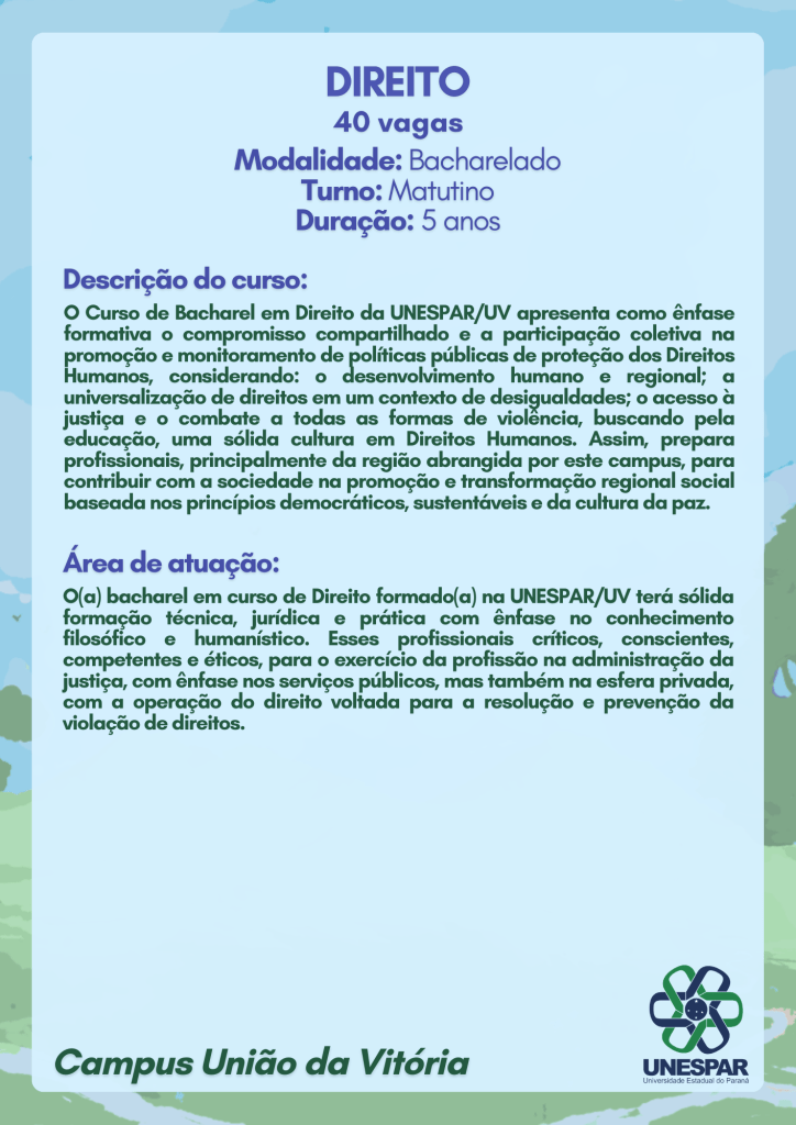 Além dos tradicionais cursos, agora o câmpus da Unespar de União da Vitória conta também com 40 vagas para o curso de Bacharel em Direito, para o turno matutino e com duração de cinco anos.