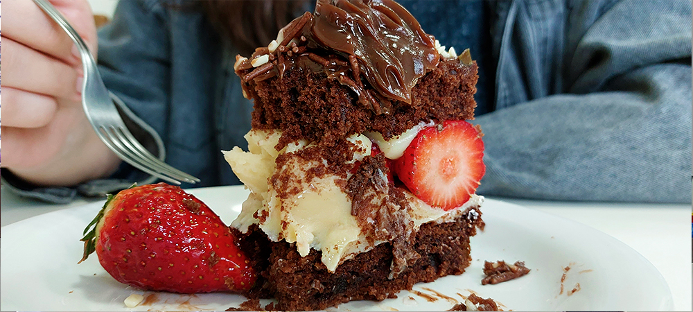 Contudo, mesmo sendo gostoso, a satisfação ocorre com algumas poucas garfadas, e um pedaço de bolo e torta já foram suficientes.