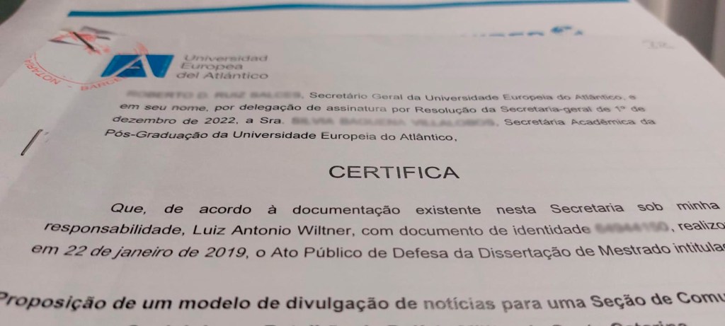 Mas, ao ver a responsável adentrar na sala com um envelope e começar a falar, mostrando que tinha em mãos o documento tão esperado, fez-me duvidar do que estava vendo. Segurei o Certificado de Defesa e li duas vezes. Ele estava agora correto. “A espera tinha acabado, finalmente! Mais um ciclo concluído – Tão longo quanto o próprio mestrado, mas concluído”. – Nem perguntei quando o documento tinha chegado, para não me aborrecer!