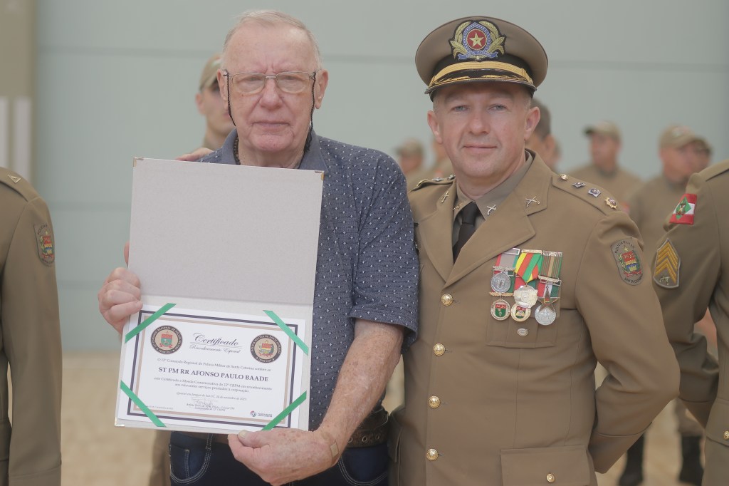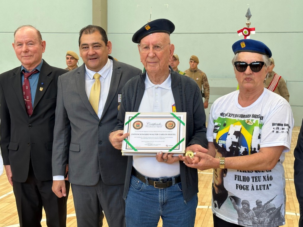O expedicionário Walter Carlos Hertel, que completará 101 anos no próximo dia 15 de dezembro, esteve presente na solenidade e recebeu da comandante do CRPM, coronel Arlene Villela, a Moeda Comemorativa da regional. Durante a entrega, a banda executou um dobrado militar especialmente para esse ato.